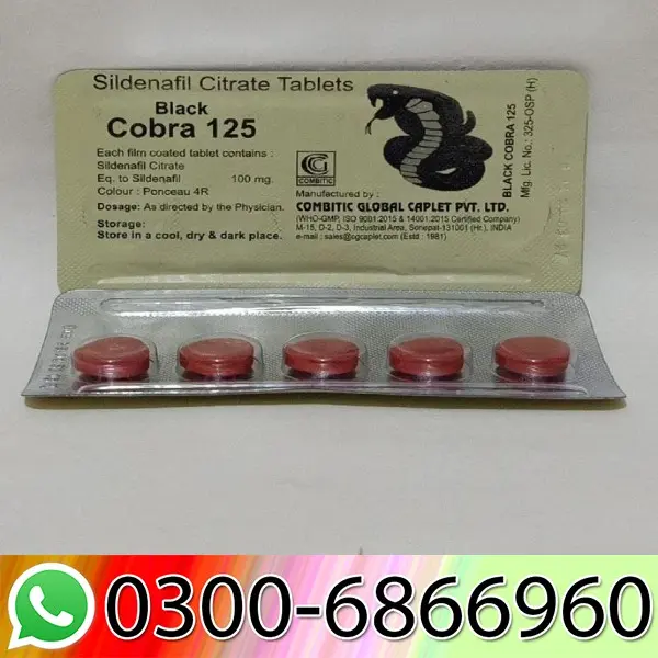 Tablets of Black Cobra Similarly, sildenafil citrate is shabby here in Pakistan. By increasing the effects of nitric oxide (NO), a chemical that serves several important limitations in regular bodily processes, Cost Cobra satisfies cravings. The extension of veins is one of the most well-known and crucial NO limitations. Get 125 mg of sildenafil citrate from Black Cobra Tablets online. This gives the muscles a more noticeable circulation system, which obviously helps a player during competition. 150 mg Black Cobra Tablet.